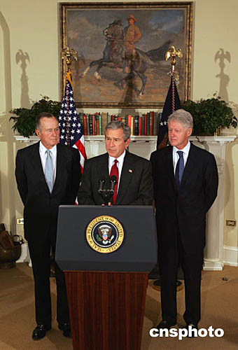 據(jù)美國(guó)白宮發(fā)言人麥克米蘭介紹,布什的父親老布什以及前總統(tǒng)克林頓,將會(huì)通過(guò)媒體采訪以及巡游全國(guó)的方式為海嘯災(zāi)民募捐。他們同時(shí)也會(huì)利用各自的“關(guān)系網(wǎng)絡(luò)”說(shuō)服公司、基金會(huì)以及富人進(jìn)行募捐。