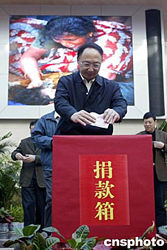 一月五日,中國國家體育總局各部門領(lǐng)導、職員以及各個項目運動員代表在北京國家體育總局舉行向東南亞受災國家人民捐款活動,國家體育總局局長劉鵬在捐款箱前捐款。中新社記者:盛佳鵬
