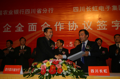 中新四川網(wǎng)1月5日電(記者肖龍聯(lián))中國(guó)農(nóng)業(yè)銀行四川省分行與四川長(zhǎng)虹電子集團(tuán)有限公司今天上午在成都錦江賓館舉行銀企全面合作簽約儀式,農(nóng)行將為長(zhǎng)虹提供綜合授信三十億元人民幣,以幫助長(zhǎng)虹克服反傾銷(xiāo)帶來(lái)的不利影響,支持長(zhǎng)虹集團(tuán)新一屆領(lǐng)導(dǎo)人確立的多元化、國(guó)際化發(fā)展戰(zhàn)略的實(shí)施。