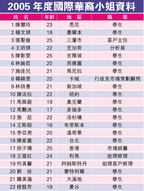 綜觀今屆候選佳麗,除青春之外,學(xué)歷更佳,過(guò)半數(shù)是大學(xué)生,甚至有碩士學(xué)歷,惟質(zhì)素就較為平庸,雖然經(jīng)過(guò)大會(huì)悉心打扮,但昨日所見(jiàn),未有突出者。佳麗之中,暫時(shí)以選美經(jīng)驗(yàn)豐富、曾是“2003MissChinaTown(USA)”第二名及紐約華裔小姐第一名的十號(hào)陳法拉樣子較為甜美。而來(lái)自三藩市的三號(hào)佳麗張圣瑩和來(lái)自布里斯本的十四號(hào)佳麗王斯婭,則憑著突出上圍令人留下印象,至于十九號(hào)來(lái)自阿姆斯特丹的何美馨,就因?yàn)橛疫呅⊥韧鈧?cè)有紋身而引人注意。