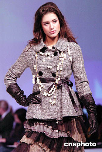 1月19日,香港會展中心舉行的“香港時裝節(jié)秋冬系列2005”上,模特在T型舞臺演繹“獨家時裝表演”專場設(shè)計師作品。作者:洪少葵