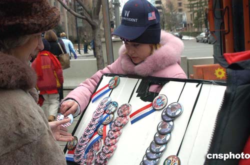 當(dāng)?shù)貢r(shí)間1月20日,在布什就職典禮會(huì)場(chǎng)外,小商販兜售帶有布什頭像的紀(jì)念章,頗為搶手。作者:余東暉