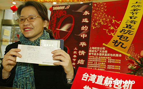 22日上午9時(shí),上海直飛臺(tái)灣包機(jī)第一名乘客,在上海松江工作的臺(tái)中縣梁純滿女士拿到了四張機(jī)票,她將乘上海首批航班29日上午8點(diǎn)45分的飛機(jī)回臺(tái)北的臺(tái)中縣和家人團(tuán)聚過春節(jié)。作者:張海峰