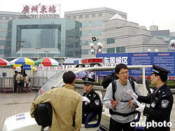 一種環(huán)保型電瓶巡邏警車開始在廣州火車東站投入使用,二十四小時在車站廣場和站臺進行巡邏,維護治安秩序。圖為電瓶車巡警在向旅客提供咨詢服務(wù)。作者:丁勇、劉亞平