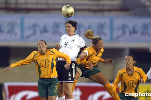 一月二十八日晚,二零零五年四國(guó)女足錦標(biāo)賽在福建泉州進(jìn)行首場(chǎng)比賽,澳大利亞隊(duì)以一比零的比分戰(zhàn)勝奧運(yùn)會(huì)和世界杯雙料冠軍德國(guó)隊(duì)。圖為德國(guó)隊(duì)九號(hào)普林茨與澳大利亞隊(duì)員爭(zhēng)頭球。作者:盛佳鵬