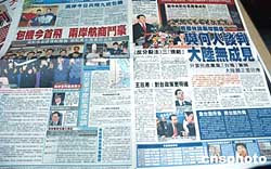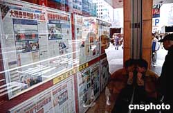倍受關(guān)注的2005年臺商春節(jié)包機1月29日啟航,香港市民一早在報館櫥窗前瀏覽有關(guān)兩岸春節(jié)包機啟航消息。作者:洪少葵
