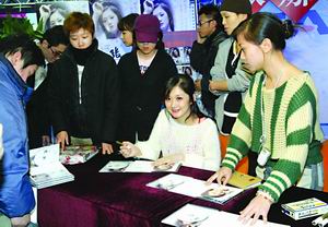 不少歌迷為了能搶占到與娜拉親密接觸的最佳位置,一大早便趕到音像店內(nèi)等候。當(dāng)娜拉帶著招牌式的可愛笑容現(xiàn)身時(shí),現(xiàn)場(chǎng)數(shù)百名歌迷立刻炸開了鍋。簽售過程中臺(tái)下眾人你推我攘好不熱鬧,拿到簽名的歌迷興奮地聚在一起展示自己的“戰(zhàn)果”,即便是不買專輯的顧客也駐足在人群外觀看,F(xiàn)場(chǎng)近乎失控的局面讓稀有文化工作人員一邊忙著維持臺(tái)上的秩序,一邊忙著呼吁臺(tái)下歌迷不要擁擠耐心等待。無奈娜拉的無敵萬人迷魅力,讓不少原本負(fù)責(zé)維持秩序的音像廣場(chǎng)工作人員和保安都被徹底征服,不時(shí)地伸長(zhǎng)脖子去看臺(tái)上的娜拉。而記者通道的管理人員只顧把關(guān)記者的進(jìn)入,絲毫不理會(huì)周遭擁擠的歌迷。(朱雅清)