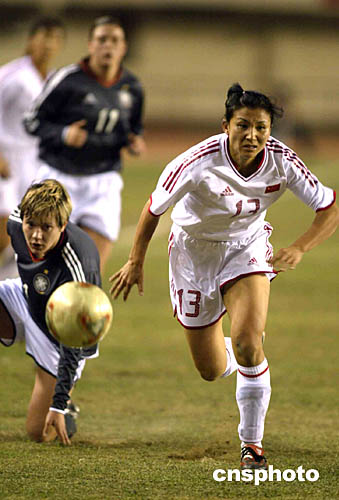 下半場比賽進行道第二十分鐘時,德國隊后衛(wèi)克斯汀·斯特曼禁區(qū)內(nèi)手球犯規(guī),中國隊獲得點球機會?上柪顫嵲谥髁P點球時太過緊張,罰球路線被德國隊門將識破,再度與進球無緣。最終,德國隊以二比零擊敗中國隊。