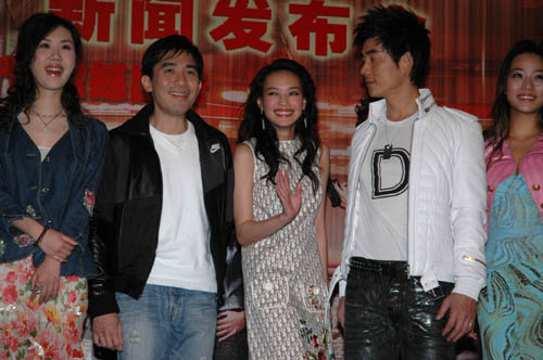 中新網(wǎng)2月2日電 據(jù)大公報報道,梁朝偉、任賢齊、舒淇及兩位韓籍女演員趙漢娜、曹秀鉉,昨日在北京出席電影《韓城攻略》的記者會,雖然當(dāng)?shù)貧鉁貫榱阆氯,但舒淇仍冒著?yán)寒穿上吊帶裙加披肩,與兩位打扮性感的韓籍女演員爭艷斗麗。