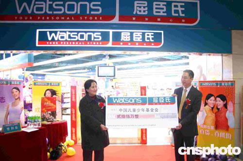 中新網(wǎng)北京二月三日電(記者張希敏)春節(jié)將至,位于北京東方廣場的屈臣氏個人護理商店,今天在重張之際,繼續(xù)向中國兒童少年基金會“春蕾計劃”捐款二十五萬元人民幣,用以救助失學(xué)女童。