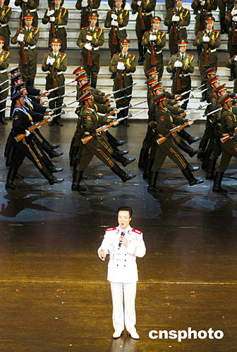 眾多解放軍文藝工作者歷時三個月創(chuàng)作的2005年軍民迎新春文藝晚會,二日晚在北京中國劇院隆重與廣大軍民見面。圖為解放軍總政治部歌舞團歌唱演員閻維文與中國人民解放軍儀仗大隊官兵,表演男聲獨唱與軍體操《軍旗下的我們》。中新社記者:王麗南