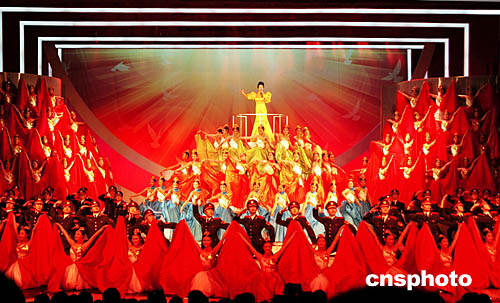 由七百多名解放軍及武警官兵參演的2005年軍民迎新春文藝晚會《春綠大地情滿懷》,二月二日晚在北京中國劇院舉行。中國國家主席胡錦濤、吳邦國、溫家寶等國家領(lǐng)導人與首都軍民歡聚一堂,共賀新春。圖為解放軍總政治部歌舞團大牌演員彭麗媛的壓軸節(jié)目《高歌向明天》的表演。中新社記者:王麗南