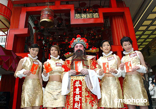 財神爺與亮麗的旗袍美女在海港城向途人派發(fā)賀年利是