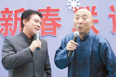 昨天,華彬大廈一層的大廳里,人聲鼎沸,笑聲不斷。在這里人們不僅見到劉蘭芳、馮鞏、李金斗、李文華、常寶華、孟繁貴等曲藝界的大腕們,同時也見到了陳佩斯、朱時茂、劉曉慶、劉歡、梁天等這些看上去原本沒有關(guān)系的演藝界明星們。聯(lián)誼會的當(dāng)家主持是中國曲藝家協(xié)會分黨組書記、相聲名家姜昆以及相聲演員孟繁貴。連主持人都是相聲演員,您說這樣的會議能不熱鬧?上面抖著“包袱”主持會議,底下你一言我一語地接話茬兒,聯(lián)誼會始終洋溢著笑聲和掌聲。