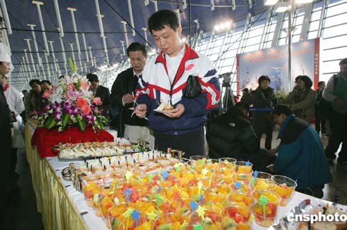 二月五日上午,東方航空公司為搭乘臺(tái)灣中華航空臺(tái)商春節(jié)包機(jī)的CI——五八五號(hào)航班返臺(tái)過(guò)年的旅客,準(zhǔn)備了精美食品。作者:湯彥俊