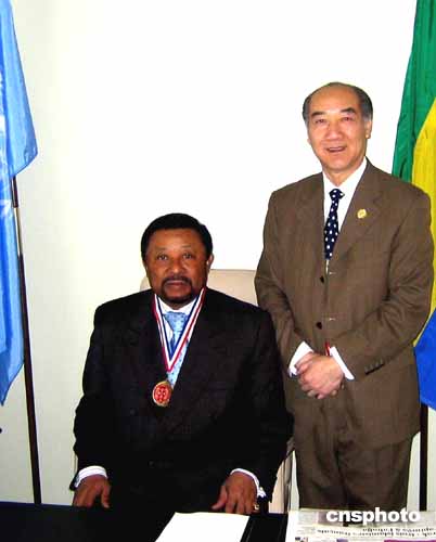 | 當(dāng)?shù)貢r間二月七日,第五十九屆聯(lián)大主席、加蓬外長讓·平(左)在聯(lián)合國辦公室接受旅美中國溫州鄉(xiāng)親章愛龍(右)贈送的“溫州之子”紀(jì)念牌,并向中國鄉(xiāng)親恭賀新年。據(jù)悉,讓·平的父親自中國溫州旅居加蓬,而他本人至今與溫州親人保持聯(lián)絡(luò)。作者:艾生