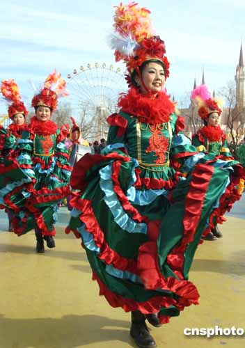 二月十日農(nóng)歷大年初二,北京石景山游樂園為北京百姓奉獻一道節(jié)日大餐——第五屆北京洋廟會。圖為身著艷麗西班牙節(jié)日盛裝的姑娘們,在石景山游樂園推出的特色品牌活動——花車行進表演中載歌載舞。作者:張勤