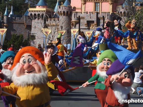 美國洛杉磯迪斯尼樂園白雪公主和卡通明星大巡游,與觀眾歡天喜地一起迎接二月春回大地。作者:賈國榮