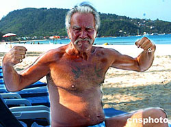 在一處海灘旅游景點(diǎn)上,一位老年游客展示其健壯身軀,表達(dá)海灘旅游的熱趣。海嘯地震過后,布吉島當(dāng)?shù)叵嚓P(guān)方面積極刺激旅游業(yè)發(fā)展,目前游客人數(shù)日益增多,往日的繁榮正在逐步復(fù)蘇。作者:宋吉河