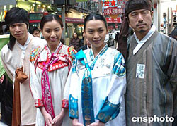 香港演員張文慈等身著韓國(guó)服飾20日亮相香港旺角鬧市區(qū)﹐為韓劇《茶母》宣傳造勢(shì)。作者:趙振清