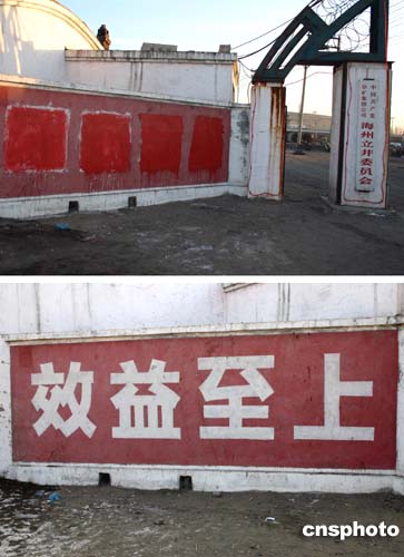 發(fā)生特大礦難的遼寧阜新孫家灣煤礦礦區(qū)的大幅標(biāo)語(yǔ)日前被涂抹遮蓋。上圖顯示“效益至上”的標(biāo)語(yǔ)被涂抹遮蓋;下圖顯示“效益至上”標(biāo)語(yǔ)未被涂抹前十分醒目。二月十四日發(fā)生的孫家灣煤礦特大礦難,已知造成二百一十四名礦工死亡,是四十多年來(lái)中國(guó)煤礦礦難事故死亡人數(shù)最多的一次。作者:中新社