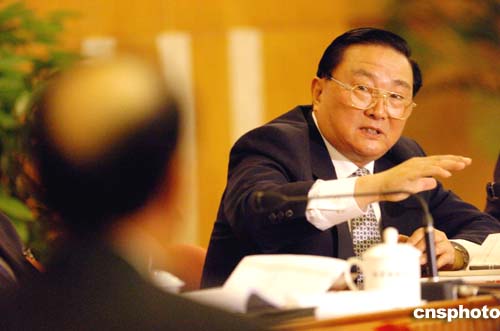 中共中央政治局常委羅干三月六日到全國(guó)人大福建團(tuán)與代表們一起審議溫家寶總理所作的政府工作報(bào)告。作者:陳文