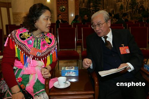 十屆全國人大三次會議三月五日在北京人民大會堂開幕,臺灣省代表?xiàng)顕鴳c與胡亞芳在休息室交談。作者:毛建軍