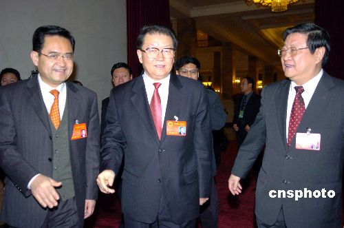 中共中央政治局常委李長春三月八日到全國人大河北代表團(tuán),與代表們一起審議《反分裂國家法(草案)》。圖為李長春與河北省委書記白克明(右)等交談。作者:陳文