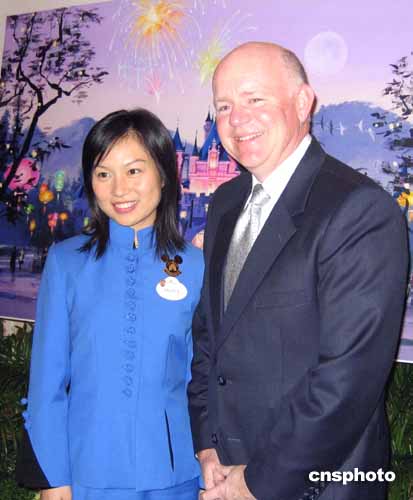 為了在開業(yè)前進行更好的推廣,香港迪斯尼的第一位親善大使已經(jīng)上任。這位名叫杜苡樂(左)的“美眉”,祖籍上海,來自在臺北,工作在香港,有著兩岸三地的親和力。她與香港迪斯尼集團行政總裁羅彬深(右),九日一同出席推廣活動。作者:關向東