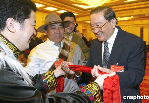 圖:四川藏族人大代表向羅干獻紅色哈達