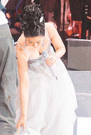 而沙麗則以高貴宮廷貴婦造型亮相,她身穿性感的白色低胸吊帶裙,披了小外套,襯以高髻發(fā)型,并佩戴閃令令的鉆石耳環(huán)及戒指,貴氣十足,但沙麗自嘲發(fā)型似菠蘿頭.之后沙麗問(wèn)歌迷介不介意她脫去外套?然后指揮家便替沙麗除去外套,沙麗說(shuō):“今晚不跳舞,不會(huì)有危險(xiǎn).今晚我買(mǎi)了保險(xiǎn),如果像我老公一樣跌傷也會(huì)有錢(qián)賠!