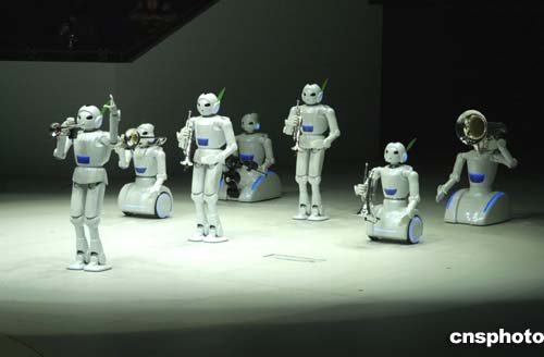 日本愛(ài)知世博會(huì)從三月十八日至二十日舉行正式開(kāi)幕前的預(yù)覽會(huì),各展館的展出內(nèi)容紛紛揭秘。圖為由豐田公司開(kāi)發(fā)的機(jī)器人樂(lè)隊(duì)在展場(chǎng)進(jìn)行音樂(lè)表演。這組吹奏樂(lè)機(jī)器人的神奇之處,在于擁有靈敏的手指和口唇,可以如同人類(lèi)演奏員一般靈巧而準(zhǔn)確地演奏各種樂(lè)曲。作者:王健
