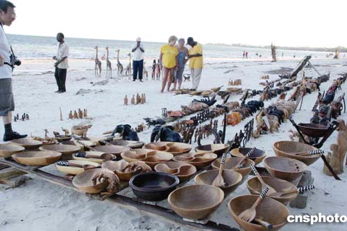 旅游熱潮正席卷全球各個(gè)角落。圖為東非旅游勝地肯尼亞蒙巴薩(mombasa)的海濱沙灘上,到處都是售賣民俗工藝品的小攤。作者:邢健