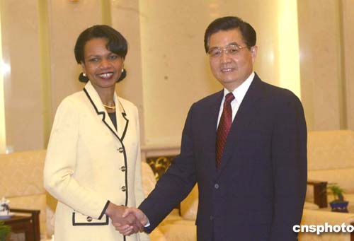 中國國家主席胡錦濤三月二十日在北京人民大會堂會見來訪的美國國務卿賴斯。作者:史利