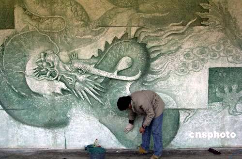 日本愛(ài)知世博會(huì)開(kāi)幕在即,中國(guó)館已經(jīng)整備完畢靜候開(kāi)展。圖為有關(guān)工作人員精心擦拭九龍紋外墻。作者:王健