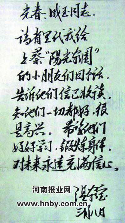 3月8日,溫總理收到來信后,欣喜地在信上批示:“光春、成玉同志:請省里代我給上蔡‘陽光家園’的小朋友們回個話,告訴他們信已收讀,知他們一切都好,很是高興。希望他們好好學習,鍛煉身體,對未來永遠充滿信心!