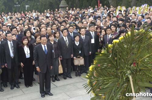 上午十點(diǎn),拜祭儀式正式開始。全體人員神情肅穆。江丙坤代表中國國民黨主席連戰(zhàn)及全體國民黨黨員向烈士敬獻(xiàn)花圈。所有團(tuán)員均向烈士三鞠躬致敬,并為烈士默哀一分鐘。祭文對(duì)烈士高度評(píng)價(jià):“壯哉先烈,死以報(bào)國,身毀名榮,英風(fēng)義烈,永為世率。”