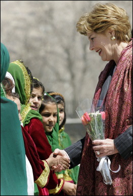 在勞拉訪(fǎng)問(wèn)阿富汗期間,美國(guó)教育部長(zhǎng)瑪格麗特·斯拜林斯一直在其左右陪同。