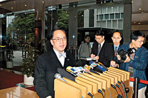 曾蔭權(quán)、律政司司長梁愛詩、政制事務(wù)局局長林瑞麟昨日開始分批會見立法會議員,昨日更率先與民建聯(lián)及民主黨的立法會議員會面。曾蔭權(quán)表示,會面的主要目的是希望探討所有實(shí)際而可行的方法,盡量確保在七月十日舉行的行政長官選舉可以順利進(jìn)行。他說:“現(xiàn)時香港市民普遍都有一個期望,希望我們在七月十日能夠順利產(chǎn)生一位行政長官,能夠掃除所有因?yàn)樾姓L官出缺而可能受影響的政府運(yùn)作,以及社會活動,和一切不明朗的因素,特區(qū)政府與立法會議員也有同樣的責(zé)任去照顧所有市民的顧慮!