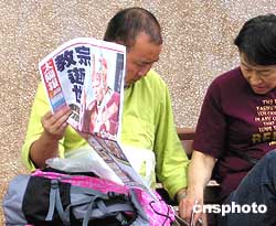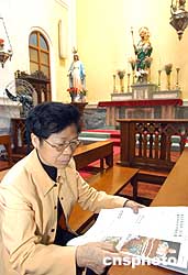 澳門一位女士在主教堂內(nèi)追思教皇,三日,當(dāng)澳門信徒得悉教皇保羅二世離世后,他們紛紛到教堂用各種形式悼念教皇。作者:梁永強(qiáng)