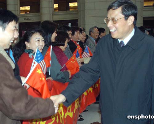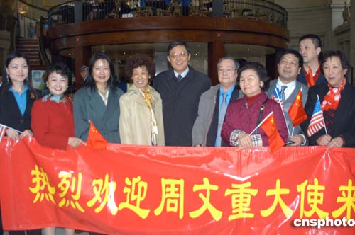 中國(guó)新任駐美大使周文重當(dāng)?shù)貢r(shí)間四月三日中午抵達(dá)美國(guó)首都華盛頓履新,受到當(dāng)?shù)厝A人僑學(xué)界代表的熱烈歡迎。