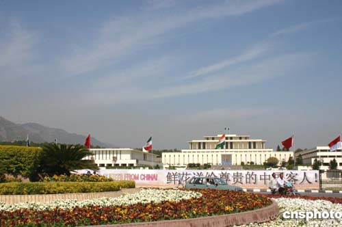 四月四日,在巴基斯坦首都伊斯蘭堡,園林工人正忙碌地?cái)[放鮮花,總統(tǒng)府前的護(hù)欄上懸掛著醒目的“鮮花送給尊貴的中國客人”的中文標(biāo)語。中國國務(wù)院總理溫家寶四月五日起將展開對巴基斯坦的訪問。作者:齊彬