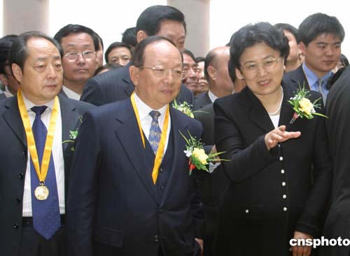 “乙酉年清明公祭軒轅黃帝典禮”4月5日在陜西橋山黃帝陵舉行,全國人大常委會副委員長許嘉璐,全國政協(xié)副主席、中央統(tǒng)戰(zhàn)部部長、中華海外聯(lián)誼會會長劉延?xùn)|,中國國民黨中常委蔣孝嚴共同祭拜中華民族始祖黃帝。圖為在軒轅殿劉延?xùn)|向蔣孝嚴介紹黃帝陵整修情況。作者:田地