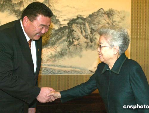 中國國務(wù)院副總理吳儀四月七日在北京會見蒙古交通運輸旅游部長、中蒙經(jīng)貿(mào)聯(lián)委會蒙方主席巴特呼。作者:滿會喬