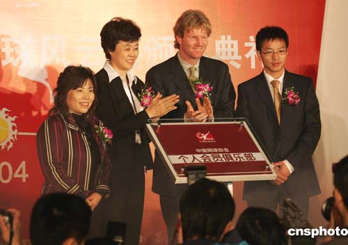 四月八日在北京舉行的“第三極中國網球峰會暨網球風云榜頒獎典禮”上,來自美國的網球“四大天王”之一考瑞爾(右二)、中國著名運動員鄧亞萍、中國網球協會副主席孫晉芳、中關村文化發(fā)展股份有限公司、第三極總裁歐陽旭(右一)等為中國網協個人會員的第一個基地揭牌。作者:武仲林