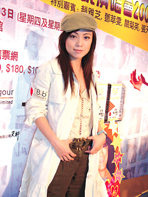 至于唱歌、跳舞及演戲,她覺得自己哪一方面最難控制?她不諱言是跳舞,因?yàn)樘柚嘤忠櫻輵蚣捌翗,所以她已要求服裝設(shè)計(jì)以安全為主,因?yàn)榧t館四方八面都是觀眾。問到安全之余會(huì)否是低胸?她笑道:“低胸也沒有驚喜啦!總之我的宗旨是視覺上可觀但又絕對(duì)安全。”她又說四位嘉賓中,以她最貪玩,所以如果大家要看她奔放,就不要太少布。