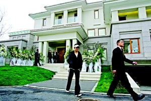 陳逸飛的靈堂就設(shè)置在他剛裝修完工的別墅里。陳逸飛的別墅是一幢歐美風(fēng)格的建筑。乳黃色的墻面和紅色的瓦,顯得雍容華貴。他在2002年花費了800萬左右買下了這所住宅,去年年底裝修完畢。