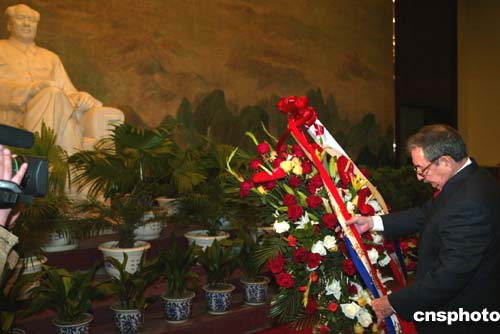 今天的參觀原本不在勞爾此次北京之行的行程安排當(dāng)中,中方應(yīng)勞爾的要求臨時增加了這項活動。勞爾于今天下午四點多抵達毛主席紀(jì)念堂,在北門外下車后步行來到紀(jì)念堂內(nèi)毛主席座像前,敬獻花圈并三鞠躬致敬。隨后,勞爾一行靜靜地瞻仰了毛主席遺容。