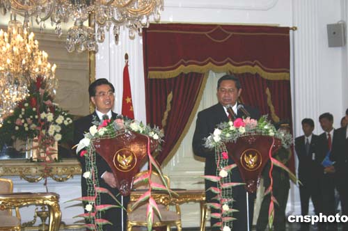 中新網(wǎng)雅加達(dá)四月二十五日電(記者李靜)中國(guó)國(guó)家主席胡錦濤二十五日在雅加達(dá)與印尼總統(tǒng)蘇希洛舉行會(huì)談。雙方共同簽署《聯(lián)合宣言》,宣布建立中國(guó)與印尼戰(zhàn)略伙伴關(guān)系。