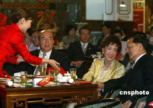 為了迎接這位“鄰家大哥”,老舍茶館的服務(wù)員分別穿上了只有在重大節(jié)日才穿的大褂和旗袍。茶館總經(jīng)理尹智君說(shuō),茶館是以辦喜事的心情來(lái)迎接連戰(zhàn)大哥及其率領(lǐng)的訪問(wèn)團(tuán),我們希望他到這里就象到了家似的。環(huán)顧茶館三樓演出大廳,木質(zhì)的廊窗,精雕細(xì)制中不失大家氣度,高掛的各式大紅的宮燈,褐色的硬木八仙桌。金色椅墊的背靠椅,黃白花紋的細(xì)磁蓋碗都透著濃郁的京味。